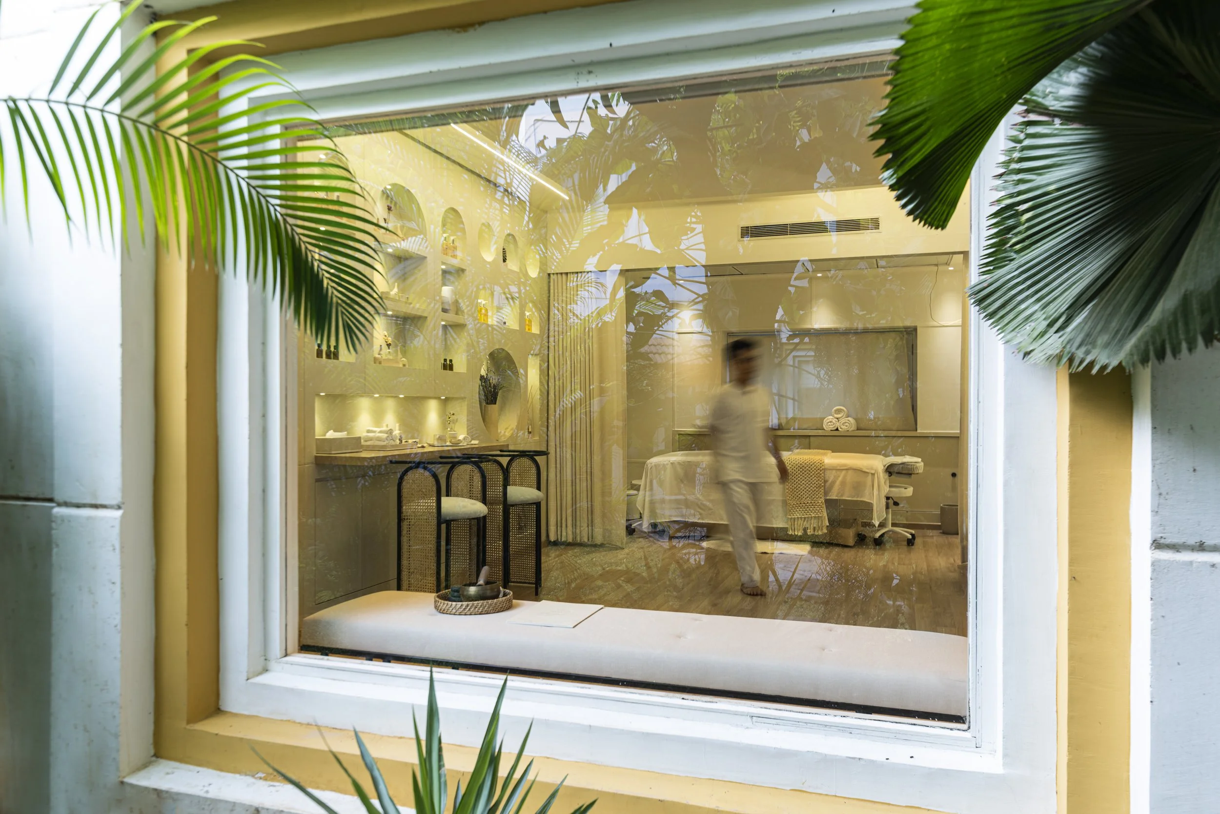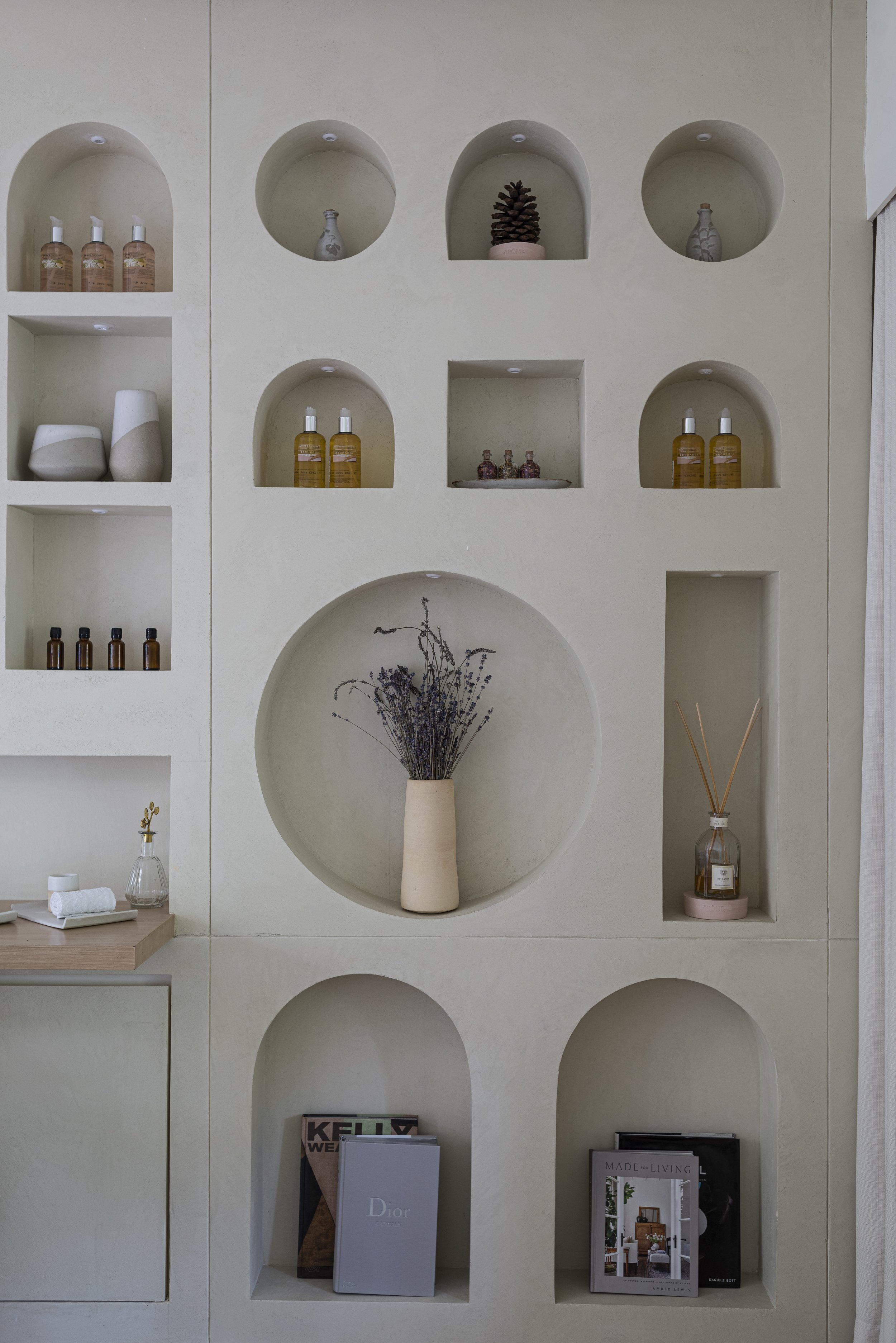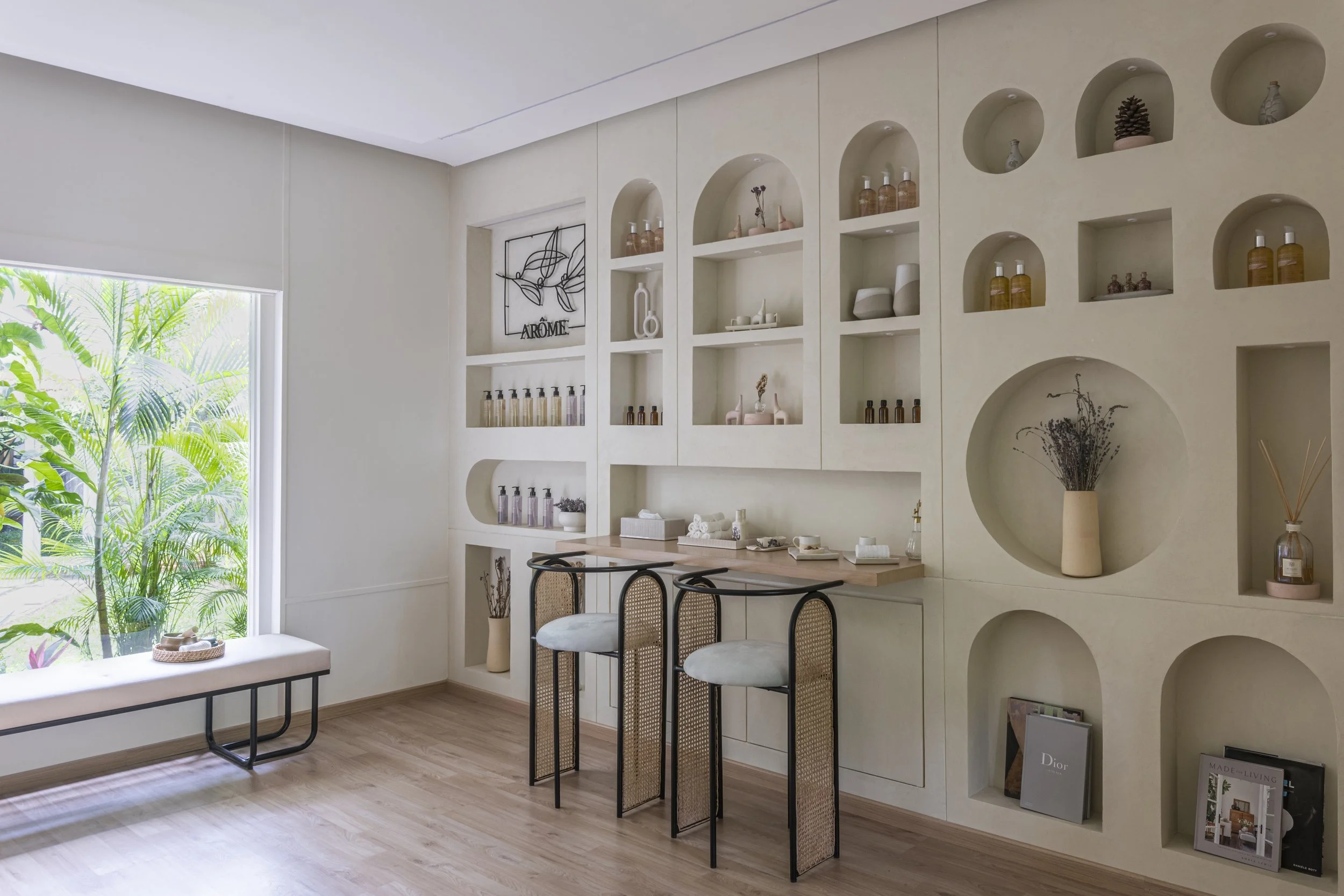 Arome is a 450 sft wellness studio designed as a serene retreat for slow living and holistic well-being. Minimal and Zen-inspired, the space uses soft beiges, creams, and earthy tones to create a calming visual language. Lime wash walls bring hand-crafted warmth, while oak floors and natural textures of linen and cane establish tactile ease. A sculptural geometric feature wall anchors the space with functional niches for display and décor. Thoughtfully selected furniture and ambient lighting enhance the studio’s quiet elegance. Arome balances practicality with gentle luxury, offering an intimate environment that encourages stillness and mindful restoration.