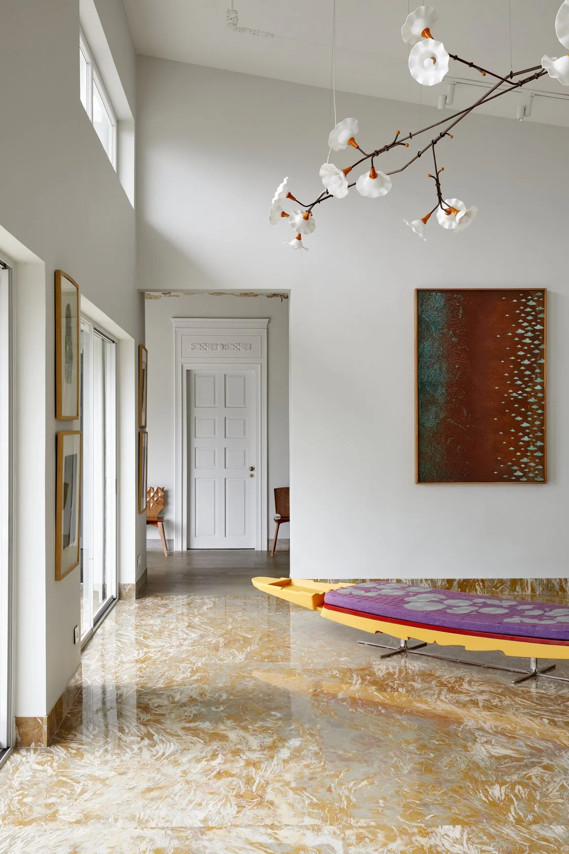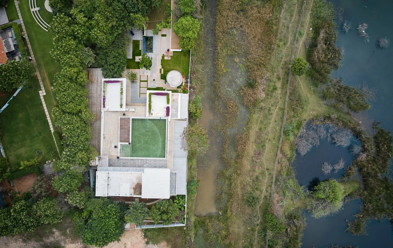 The Serene Edge is a 13,500 sft lakeside residence that celebrates art, craftsmanship, and nature. Designed for a couple in their 50s, the home serves as both a retreat and a gallery for an extensive art collection. Local materials like Kota stone, river quartz, and handcrafted brass details bring an understated luxury, while bespoke furniture by Sandeep Sangaru and decorative lighting by Arjun Rathi balance tradition and modernity. Thoughtful space planning, lighting, expansive glazing, and fluid transitions frame the ever-changing landscape, especially during the monsoon. The result is a calm, contemporary home that honours Indian craft, embraces natural surroundings, and offers a refined canvas for art and living.